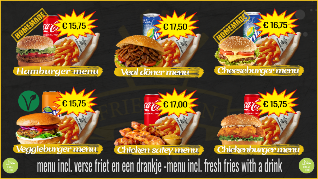 Menu is burger naar keuze op een broodje met verse friet en een drankje